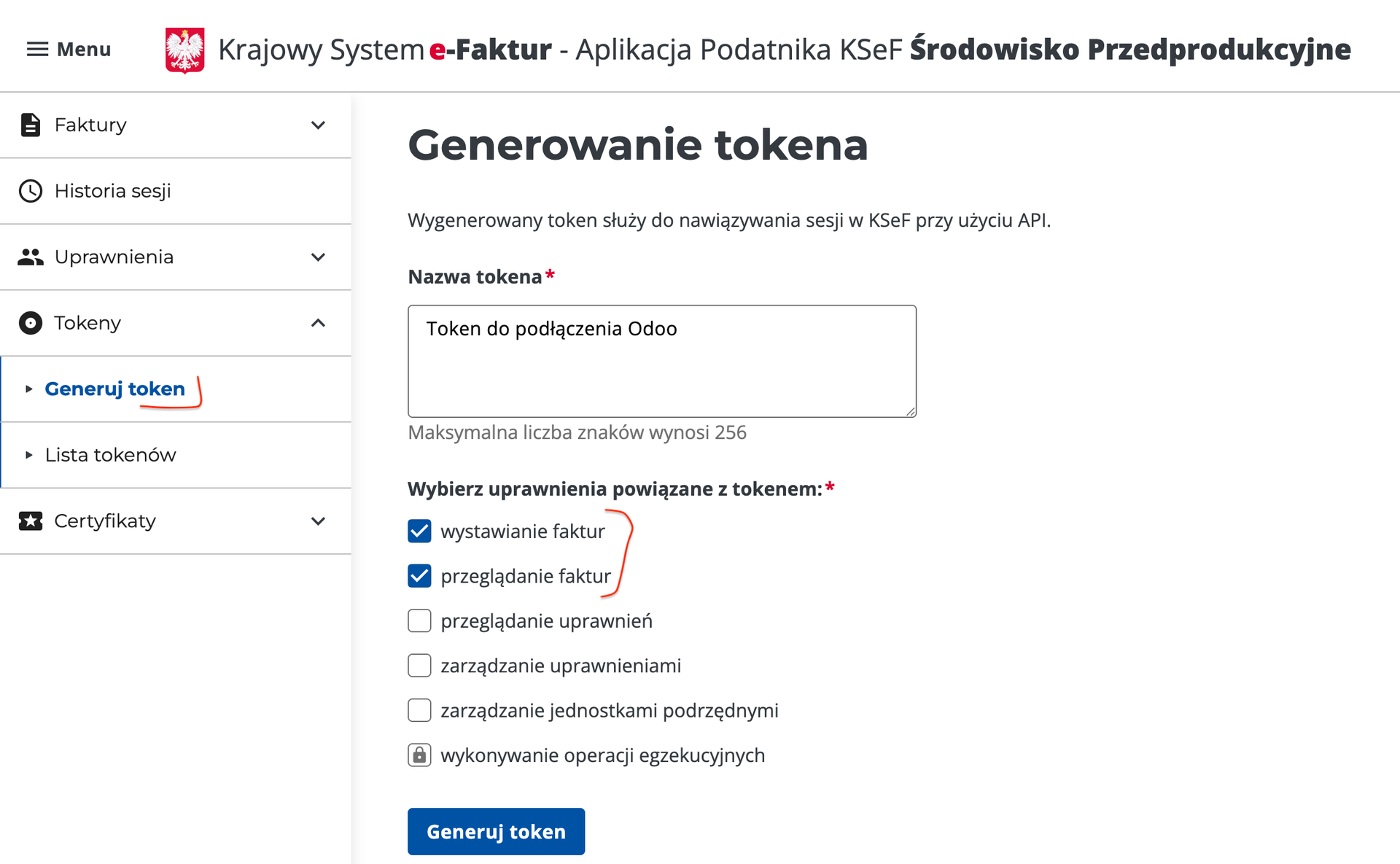 1. W Aplikacji Podatnika KSEF (środowisko PREPROD https://ap-demo.ksef.mf.gov.pl/) wygenerować tokenu (z uprawnieniami do wystawiania i przeglądania faktur):