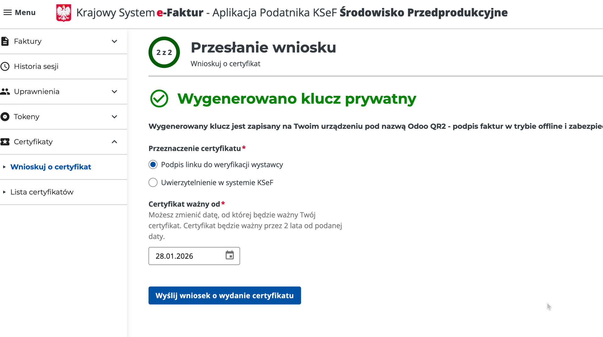 2. W Aplikacji Podatnika KSEF złożyć wniosek o certyfikat do podpisu linku (proszę się nie denerwować - to nie my to wymyśliliśmy...)