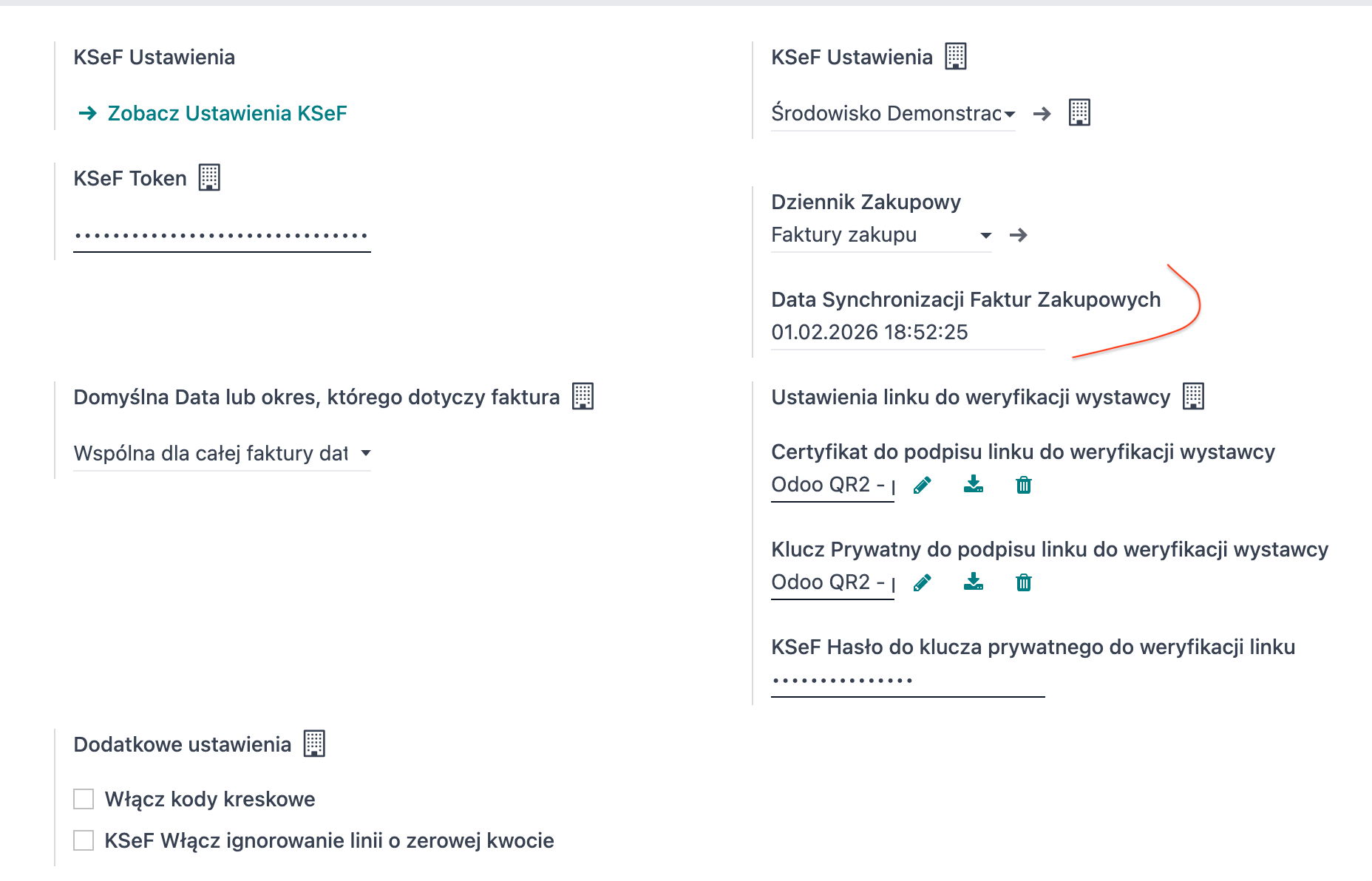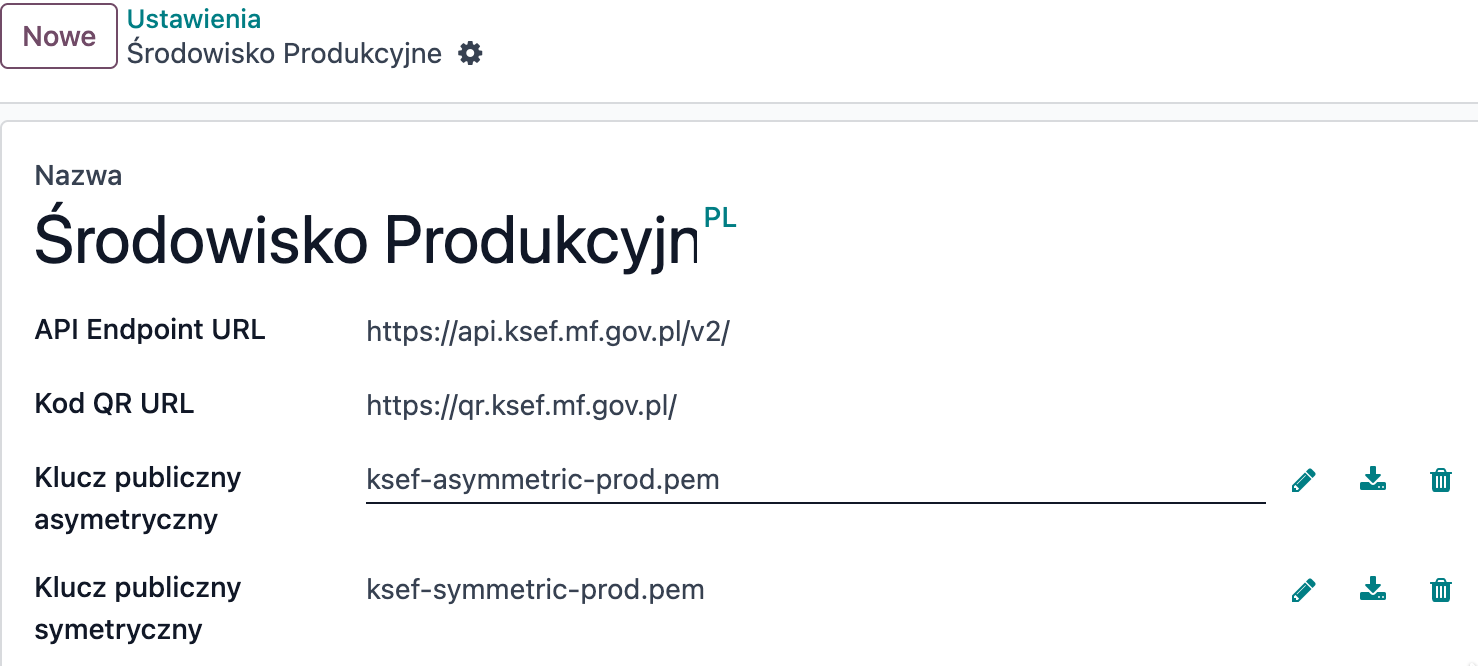 a. KSeF Ustawienia -> środowiska z którym następuje połączenie (na testy rekomendujemy środowisko demonstracyjne - preprod, na Odoo PROD środowisko PROD - ale to od 01.02.2026 - kiedy to będą dostępne i linki do środowiska prod KSEF i dane do połączenia)