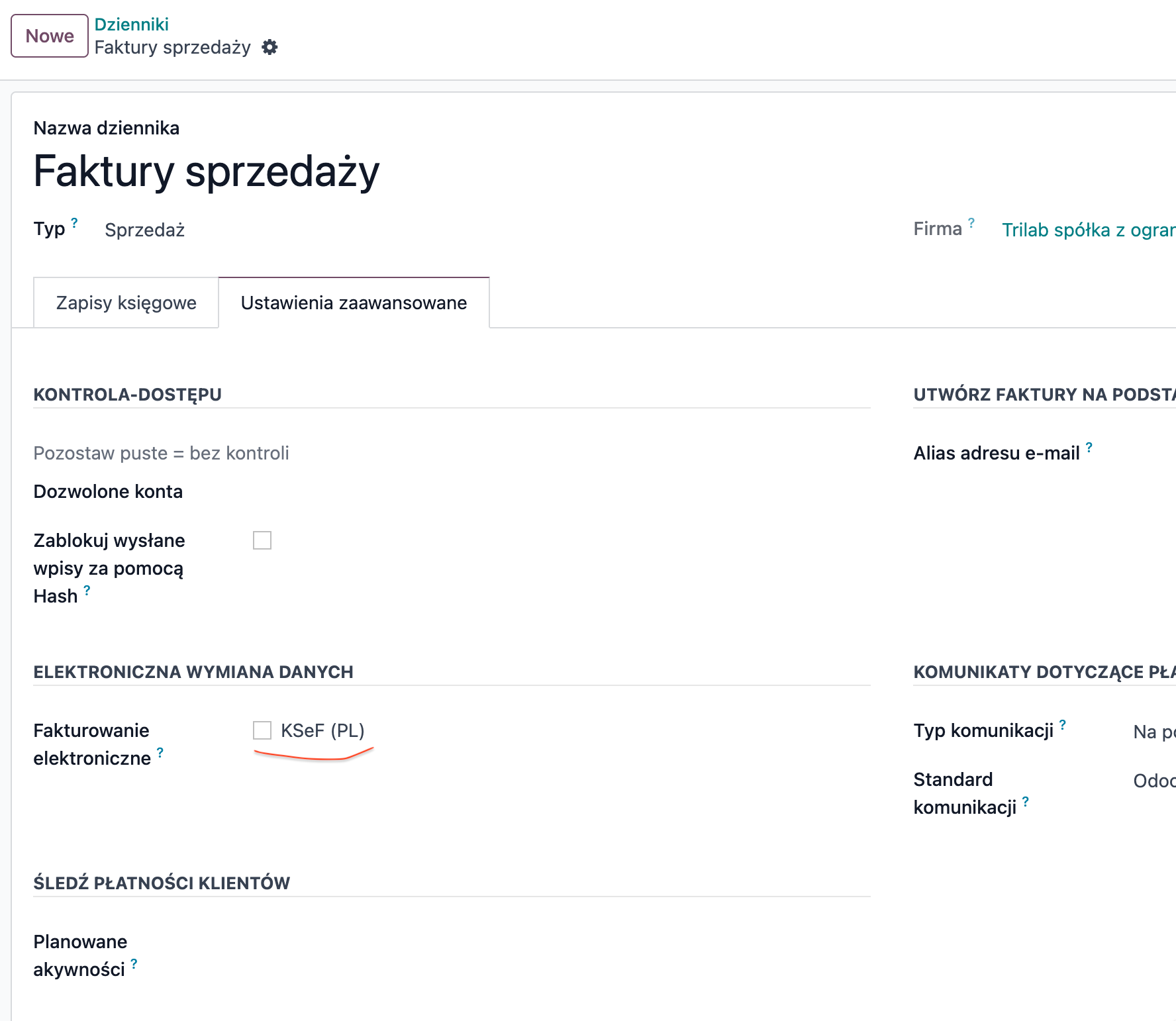Dla użytkowników którzy zainstalowali nasz moduł ale go nie podłączyli do KSEF lub nie chcą wysyłać jeszcze faktur do KSEF a tylko je pobierać przypominamy (że jak w standardzie Odoo) jest możliwość wyłączenia dzienników sprzedaży z obsługi efaktur: