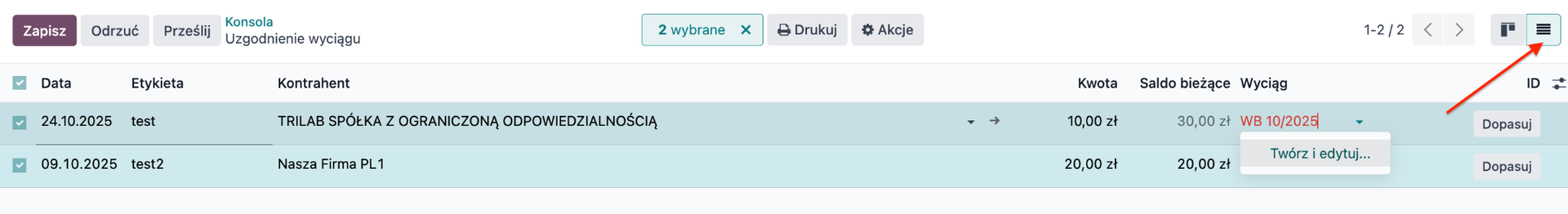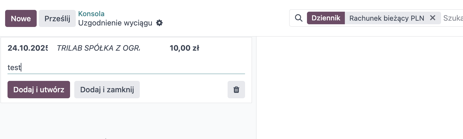 Transakcje można również utworzyć z poziomu widoku listy. W tym widoku dostępne jest dodatkowe pole „Wyciąg”, które służy do przypisania transakcji do konkretnego wyciągu bankowego. W Odoo zapisy bankowe bazują na transakcjach, natomiast sam wyciąg stanowi jedynie odnośnik, do którego te transakcje można przypisać.