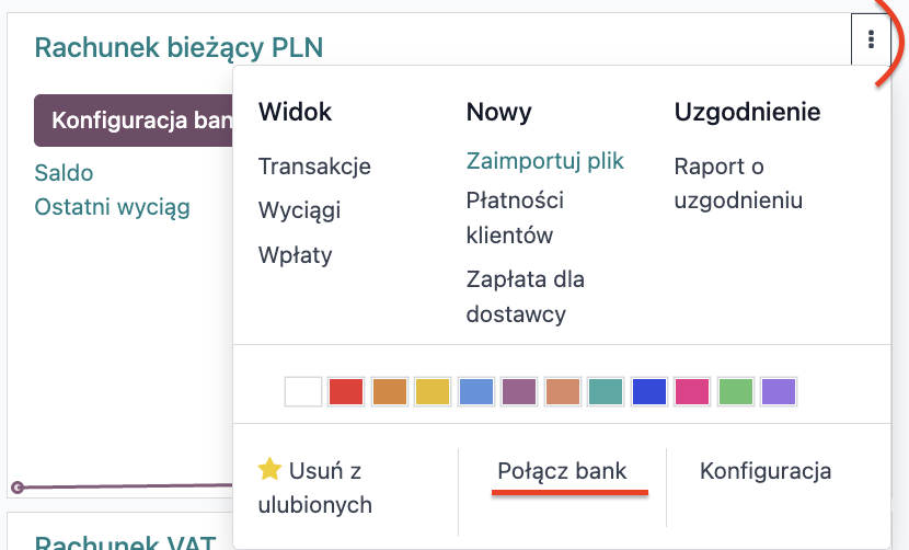 Odoo w standardzie umożliwia bezpośrednią synchronizację z bankiem, dzięki czemu wszystkie wyciągi bankowe są automatycznie importowane do systemu. Aby nawiązać połączenie z bankiem lub sprawdzić, czy dany bank jest kompatybilny z Odoo, należy wybrać opcję „Połącz bank” w wybranym dzienniku.