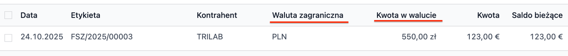 Kurs do transakcji bankowej pobierany jest z daty tej transakcji. Jeśli chcemy zastosować inny kurs, można przejść do widoku liniowego i uzupełnić pola Waluta zagraniczna oraz Kwota w walucie. System wtedy użyje tego przeliczenia do uzgodnienia transakcji.