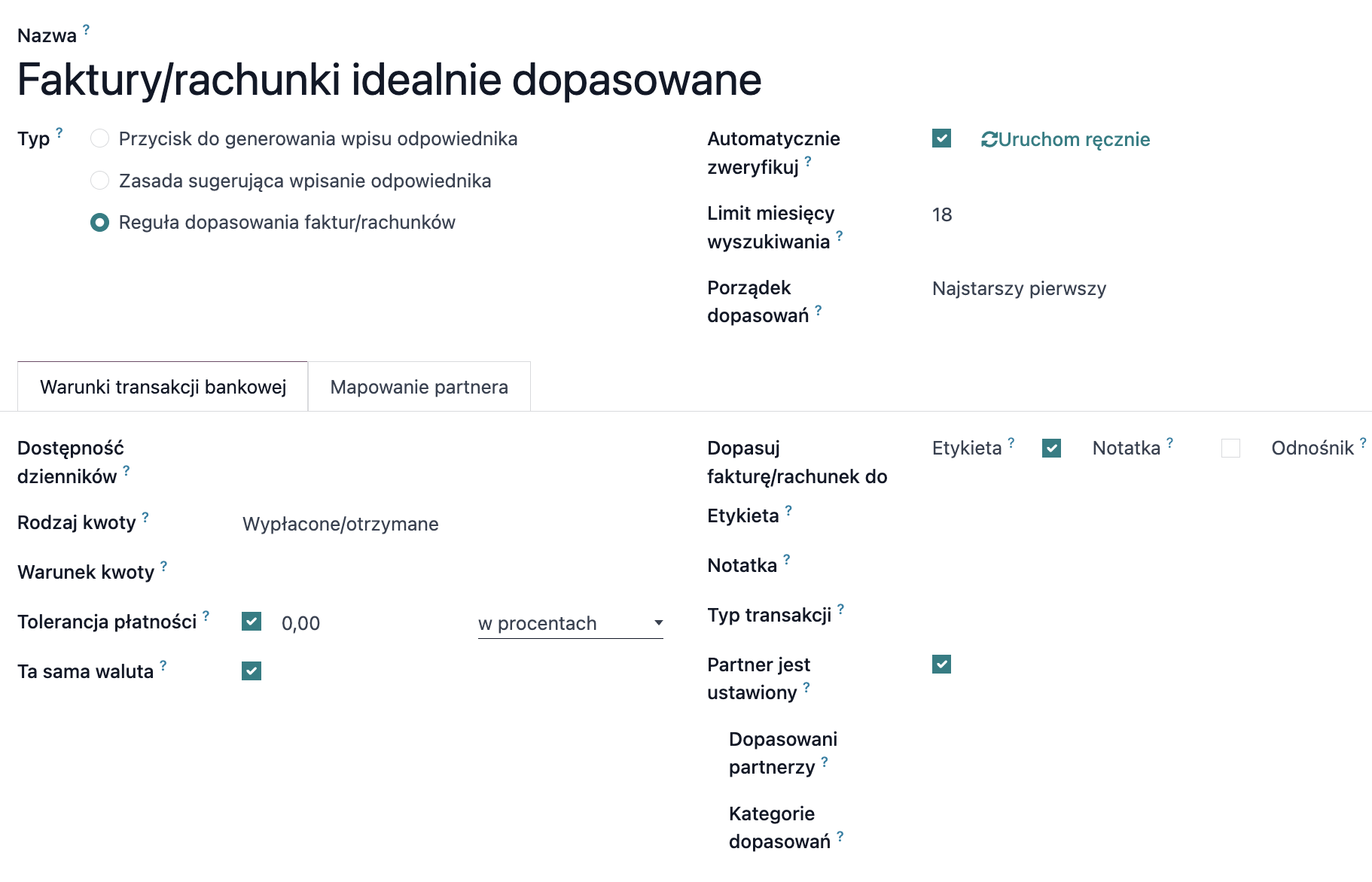 W Odoo istnieje również model, który może automatycznie łączyć transakcje z odpowiednimi zapisami księgowymi na podstawie różnych pól. Model ten można skonfigurować tak, aby automatycznie weryfikował i zatwierdzał dopasowania. W razie potrzeby można go dostosować do własnych wymagań np. tak, aby nie wymagał ustawionego kontrahenta.
