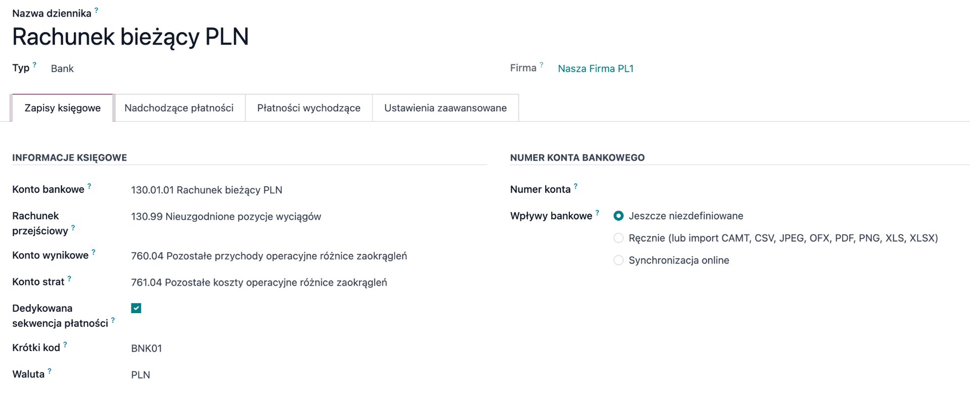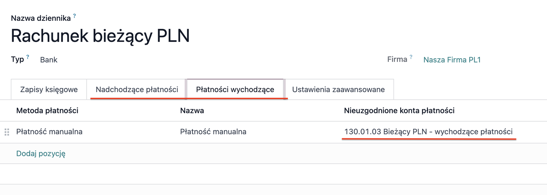 W zakładkach Nadchodzące płatności i Płatności wychodzące można skonfigurować konta, na które trafią zarejestrowane płatności do momentu ich uzgodnienia z wyciągiem bankowym. Rejestrowanie płatności na fakturach jest szczególnie przydatne w przypadku korzystania z funkcji wysyłki płatności z Odoo do banku (więcej informacji dostępnych tutaj). Warto wówczas utworzyć osobne konta dla płatności przychodzących i wychodzących. Przy takiej konfiguracji, po zarejestrowaniu płatności na fakturze tym dziennikiem, jej status zmieni się na W trakcie płatności, a dopiero po uzgodnieniu wyciągu bankowego z płatnością – na Zapłacono.