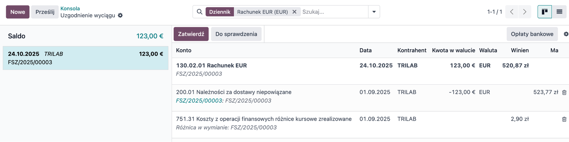 Ważnym aspektem do poruszenia jest również uzgadnianie transakcji na rachunkach walutowych. Jeżeli kurs na fakturze różni się od kursu użytego przy transakcji bankowej, Odoo automatycznie tworzy różnicę kursową podczas uzgodnienia. System przypisuje ją na odpowiednie konto różnic kursowych, tak aby obie strony się bilansowały.