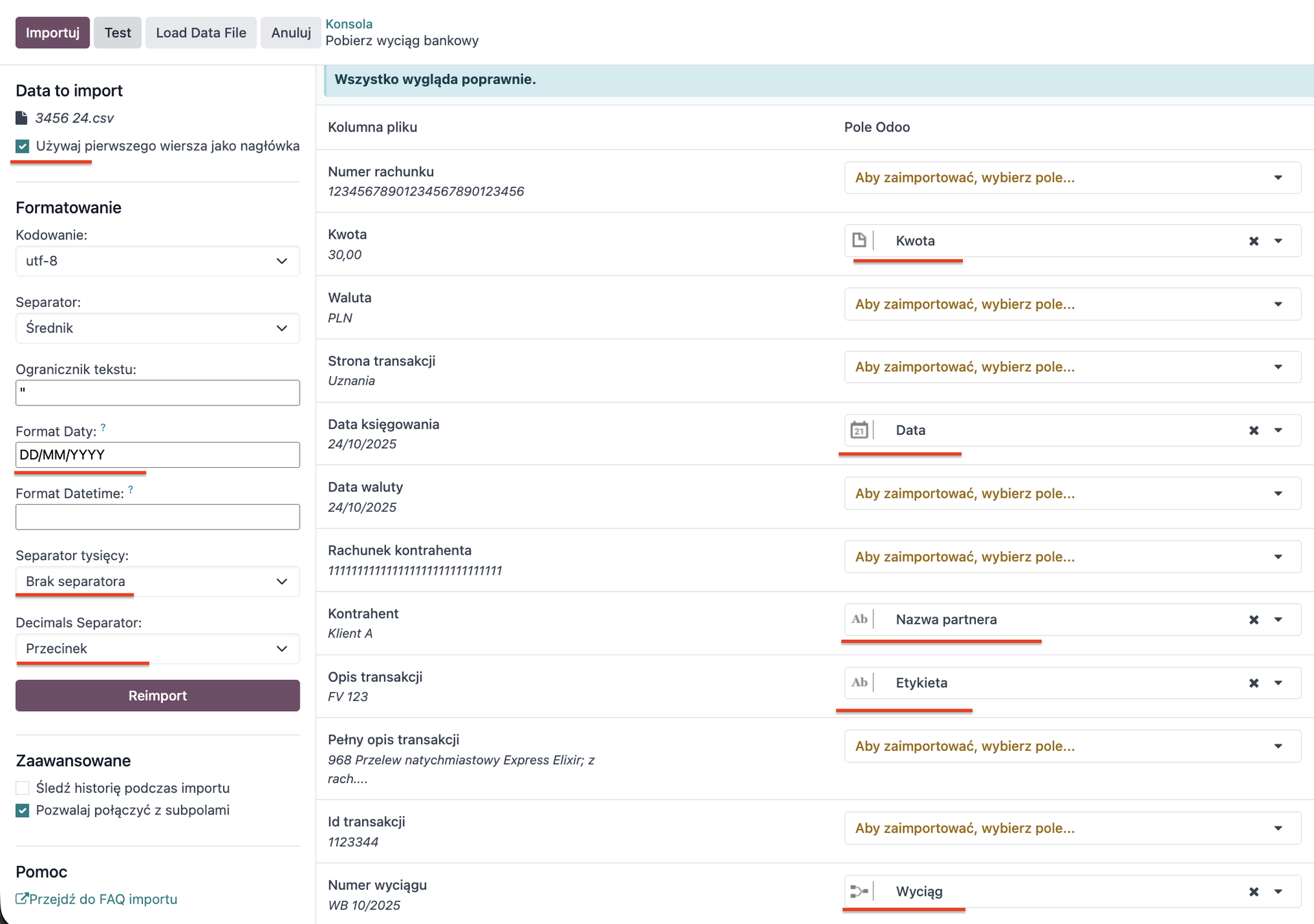 Po wykonaniu tych czynności można przetestować import, klikając przycisk Test. Jeśli wszystko jest poprawnie skonfigurowane, pojawi się komunikat „Wszystko wygląda poprawnie”, po czym można kliknąć przycisk Importuj.