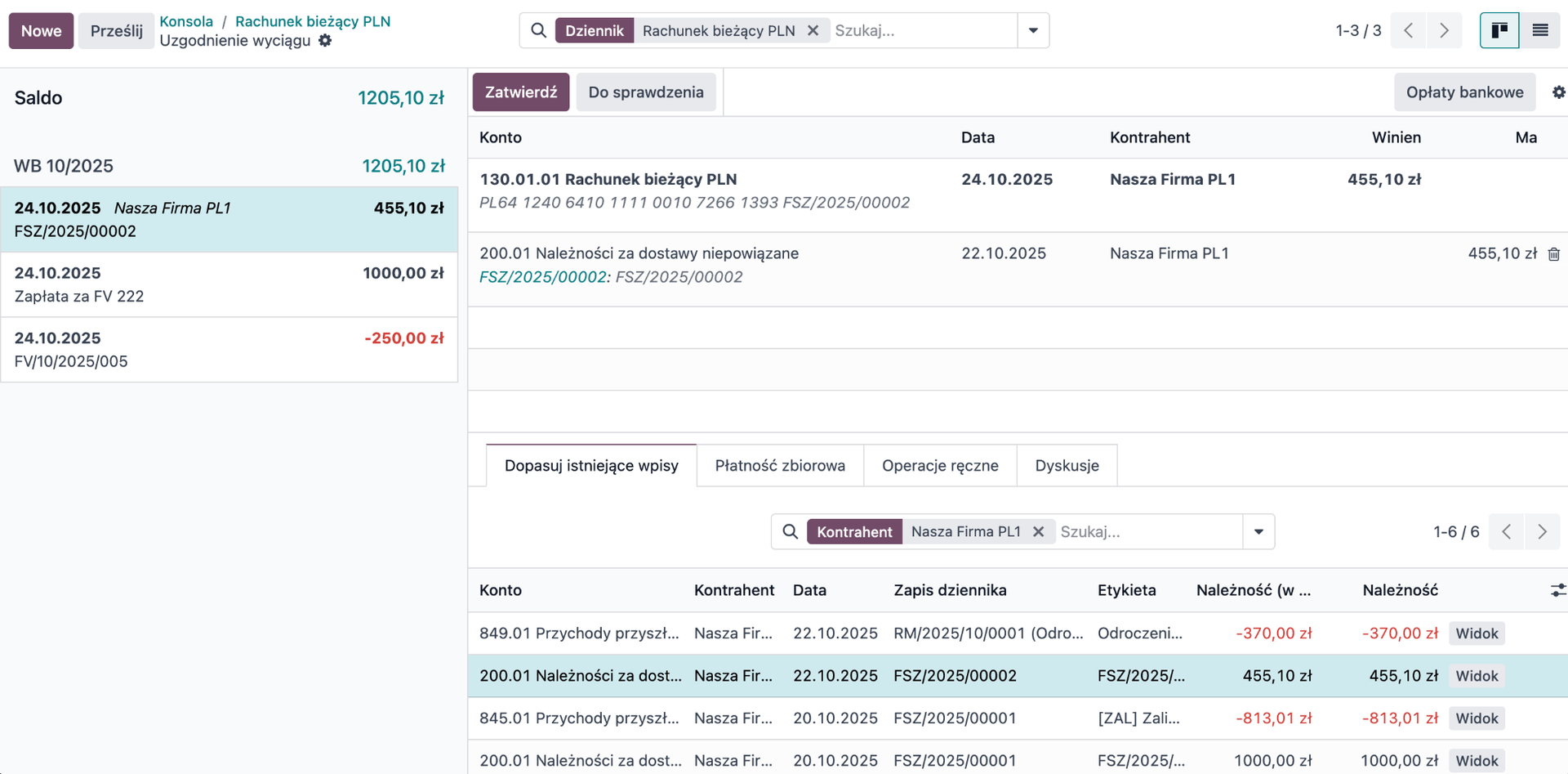 Po kliknięciu danej pozycji na liście w zakładce Dopasuj istniejące wpisy Odoo wyświetla wszystkie dostępne zapisy księgowe, które mogą odpowiadać tej transakcji. System automatycznie sugeruje wpis najlepiej pasujący, biorąc pod uwagę m.in. kwotę, etykietę i kontrahenta. Użytkownik może następnie zatwierdzić proponowane dopasowanie lub wybrać odpowiedni wpis ręcznie. Po zatwierdzeniu uzgodnienia przy transakcji pojawi się zielony symbol dopasowania.