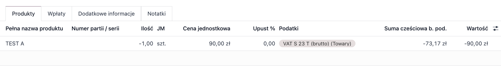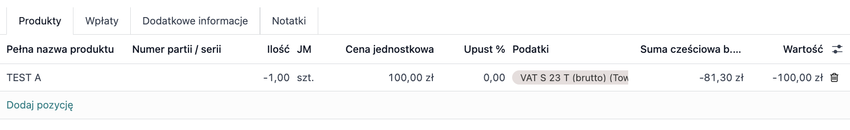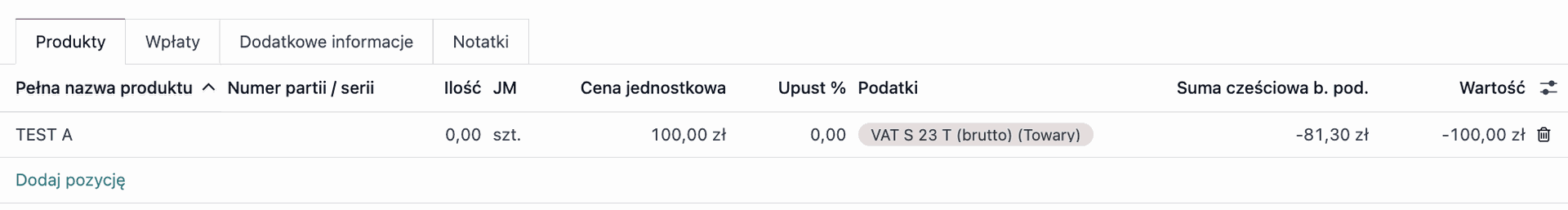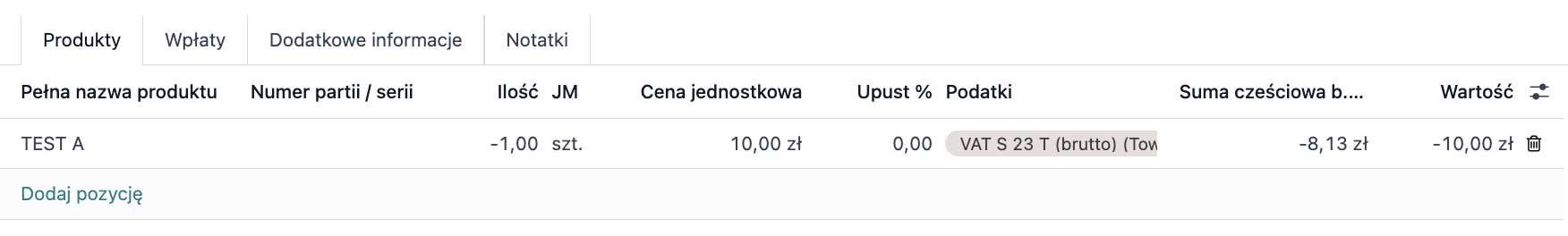 Na utworzonym zwrocie pojawią się obie pozycje z ujemną ilością. Zamiast ustawiania ilości 0 przy produkcie, który nie jest zwracany, zalecamy usunięcie tej pozycji. W rezultacie na zwrocie pozostanie tylko produkt TEST A.