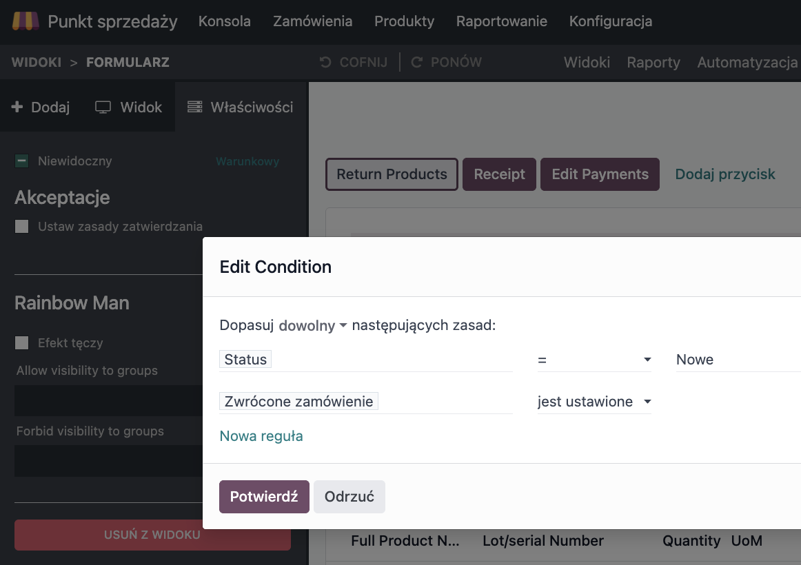 W Odoo domyślnie przycisk Zwrot produktów nie jest widoczny, gdy wszystkie pozycje z zamówienia zostały już zwrócone. Oznacza to, że po wykonaniu zwrotu wartościowego przycisk ten nie pojawi się na oryginalnym zamówieniu, co uniemożliwia wykonanie rzeczywistego zwrotu towaru w późniejszym czasie. Aby to obejść, można w Odoo Studio zmienić domenę tego przycisku tak, aby był widoczny zawsze (z wyjątkiem zwrotów i zamówień w stanie draft), stosując poniższy warunek: